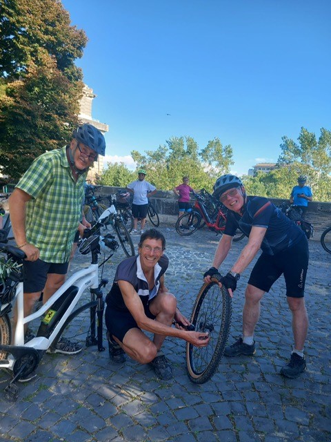 Am Nachmittag radelten wir schließlich am Kolosseum und am Nationaldenkmal Viktor Emanuels II. vorbei und erreichten unser Quartier in Rom. Am folgenden Tag durchschritten wir im Heiligen Jahr 2025 die Heilige Pforte der Basilika Santa Maria Maggiore, wo Papst Franziskus begraben liegt. Auch die Heilige Pforte des Petersdoms passierten wir. Während einige auch die Spanische Treppe und den Trevi Brunnen bewunderten, spazierten mein Mann und ich auf den Hügel Gianicolo. Dort hatten wir einen wunderbaren Ausblick auf Rom. Am 2. September wurde unsere Gruppe mit den zwei Bussen wieder nachhause gebracht. Danke allen Radpilgern für die Gemeinschaft und für alles, was dazu beitrug, dass diese Reise zu einem unvergesslichen Erlebnis wurde.