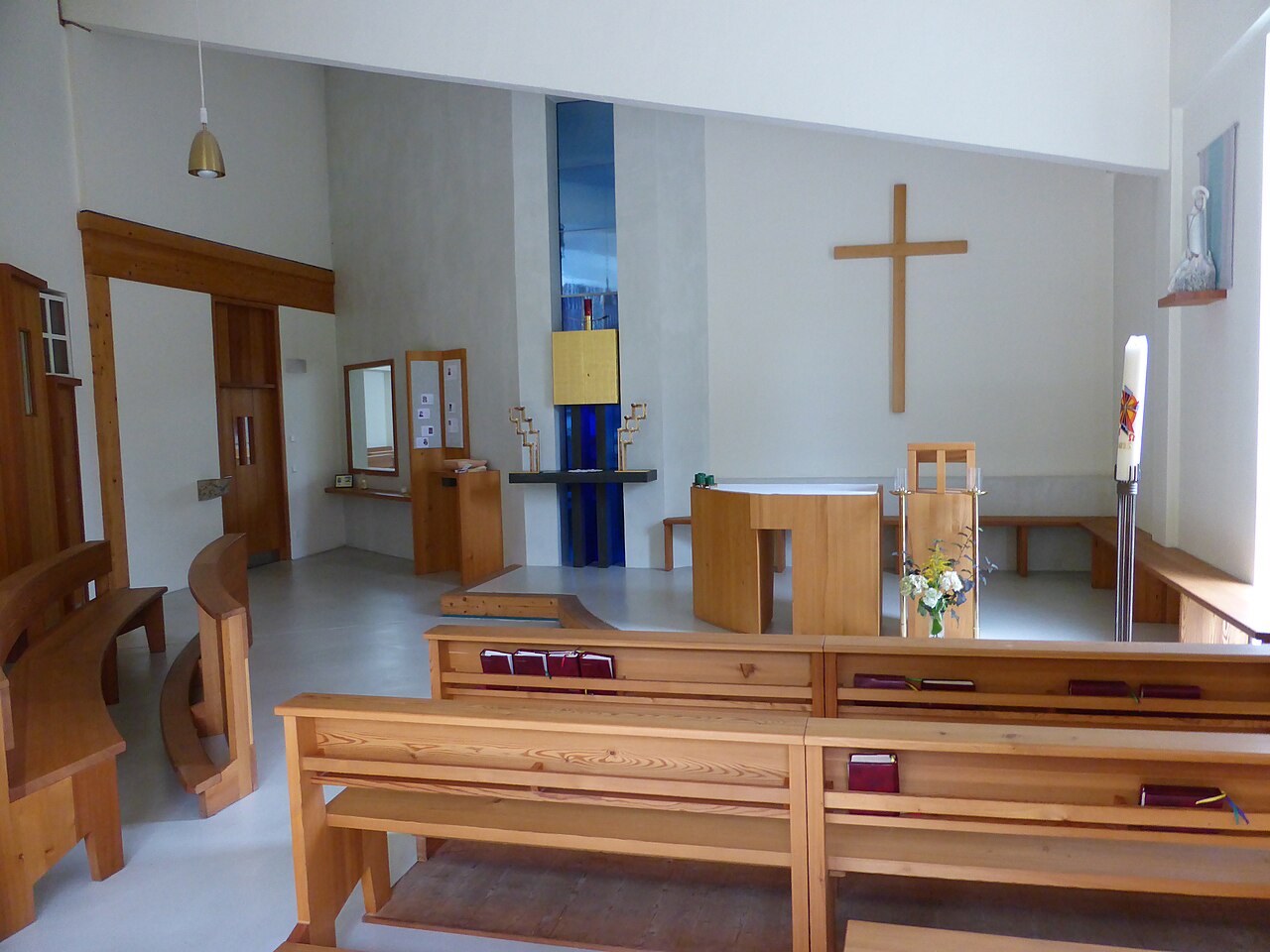 Das Altarbild von Michaela Petra Sturm ist abstrakt gestaltet und verleiht dem Altarbereich einen würdigen Rahmen. Die Bibel verbietet realistische Darstellungen, daher vermittelt das Bild durch Farben und Symbole tiefere religiöse Bedeutungen.